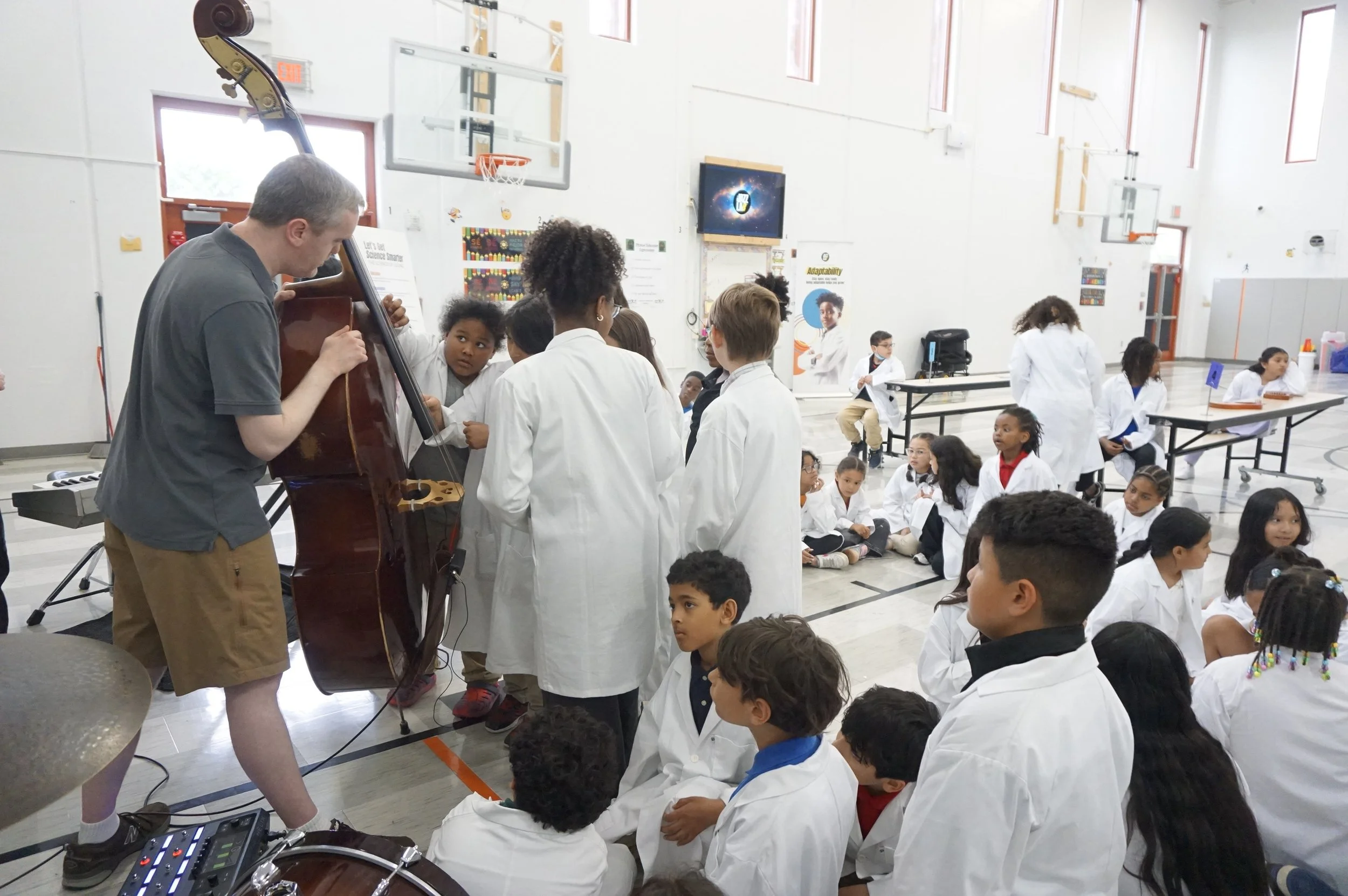 Every Jazz Lab™ engagement begins and ends with live music, setting the stage for an exciting learning experience! In this first session, our Jazz Lab Techs (JLTs) dive into sound science—exploring vibration, pitch, frequency, resonance, and timbre through a guided look at instrument anatomy. This is followed by hands-on STEM activities, culminating in a fun, movement-based activity where they organize sounds and rhythms together.